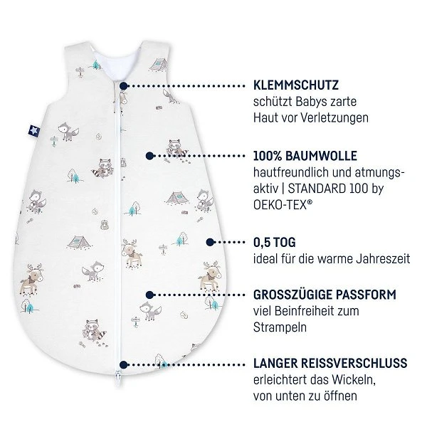 Der leichte Zöllner Jersey Sommerschlafsack besteht aus weichem Baumwoll-Jersey, ist besonders anschmiegsam, sanft zur Haut und für warme Sommernächte geeignet. Der robuste, mittlere Reißverschluss macht das nächtliche Windeln wechseln zum Kinderspiel.